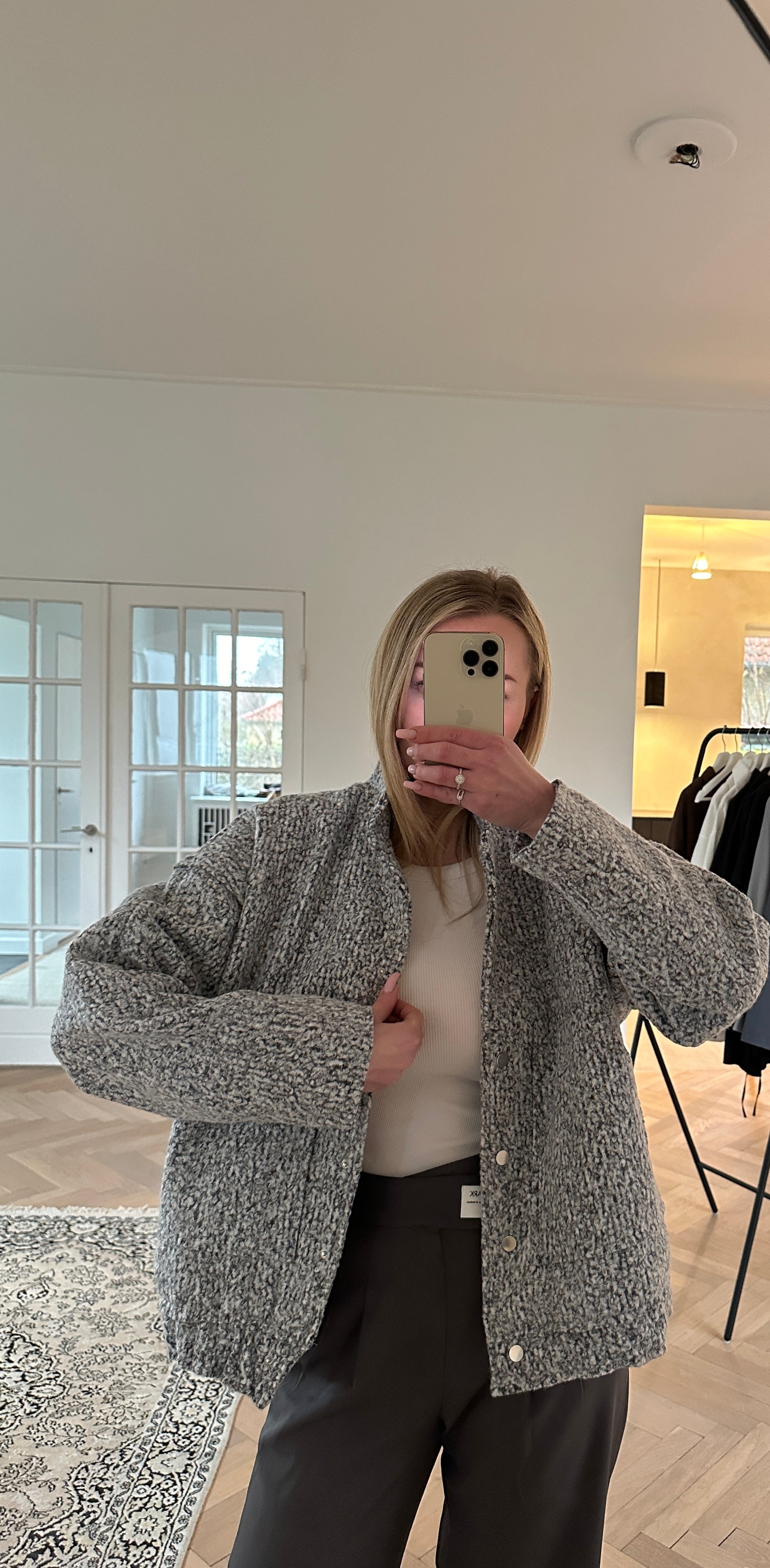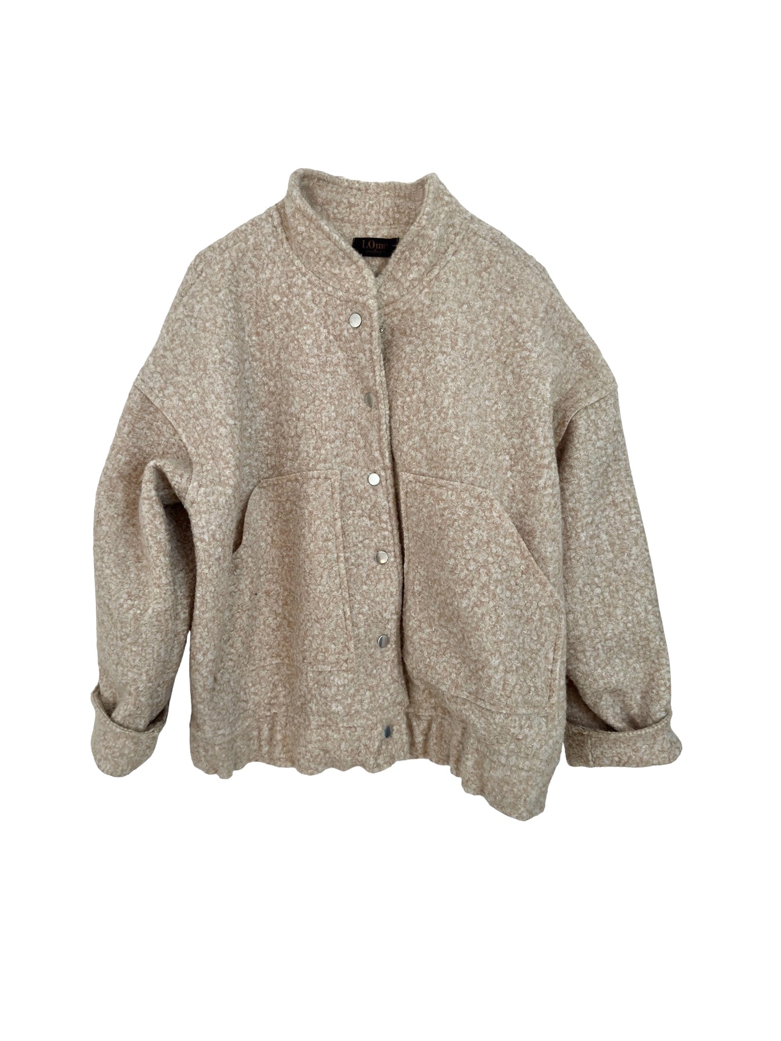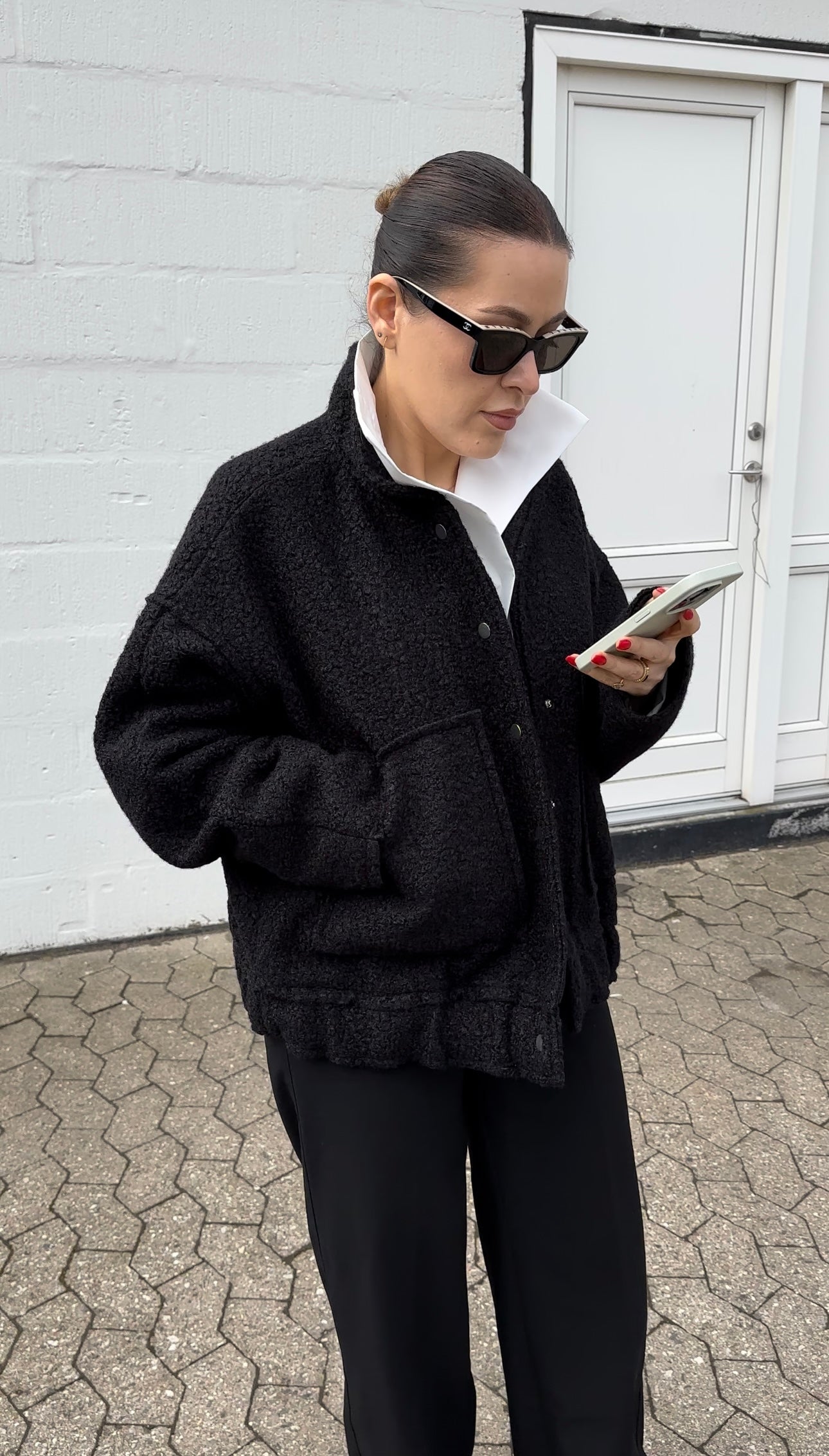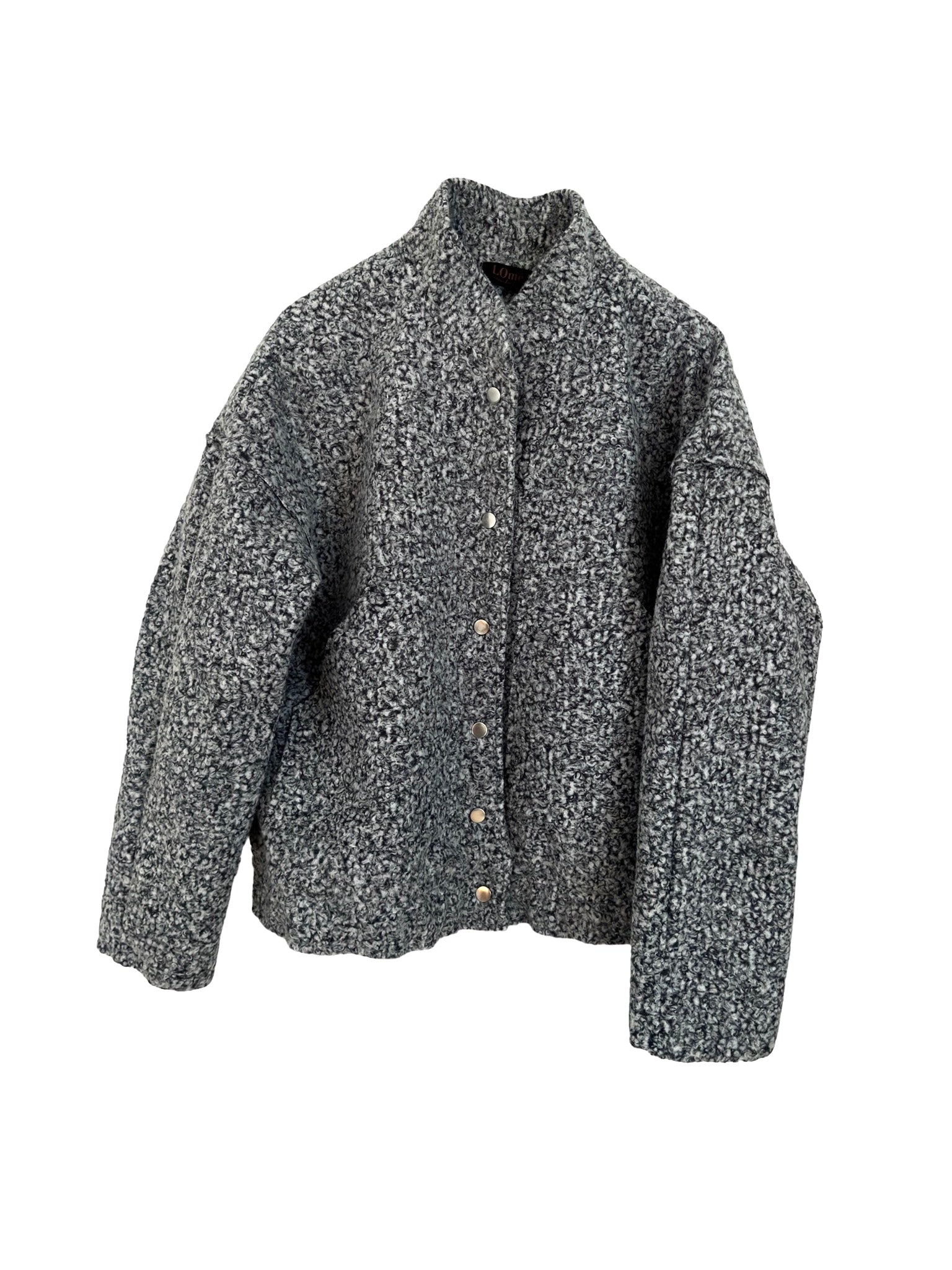 Super cool bomber jakke med høj hals og løs pasform. LOmé bomber jakken er designet som en kort jakke med en bred elastik forneden og lukkes med trykknapper.
