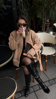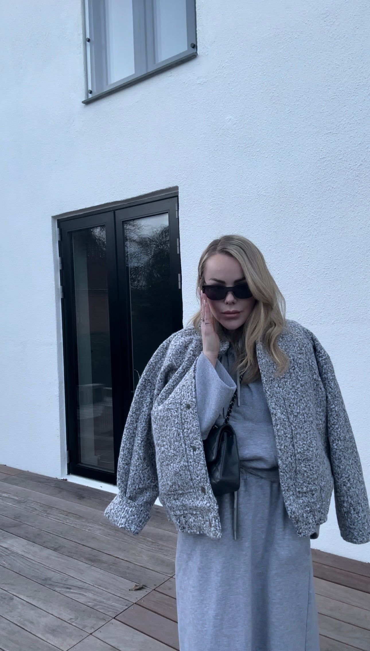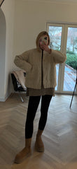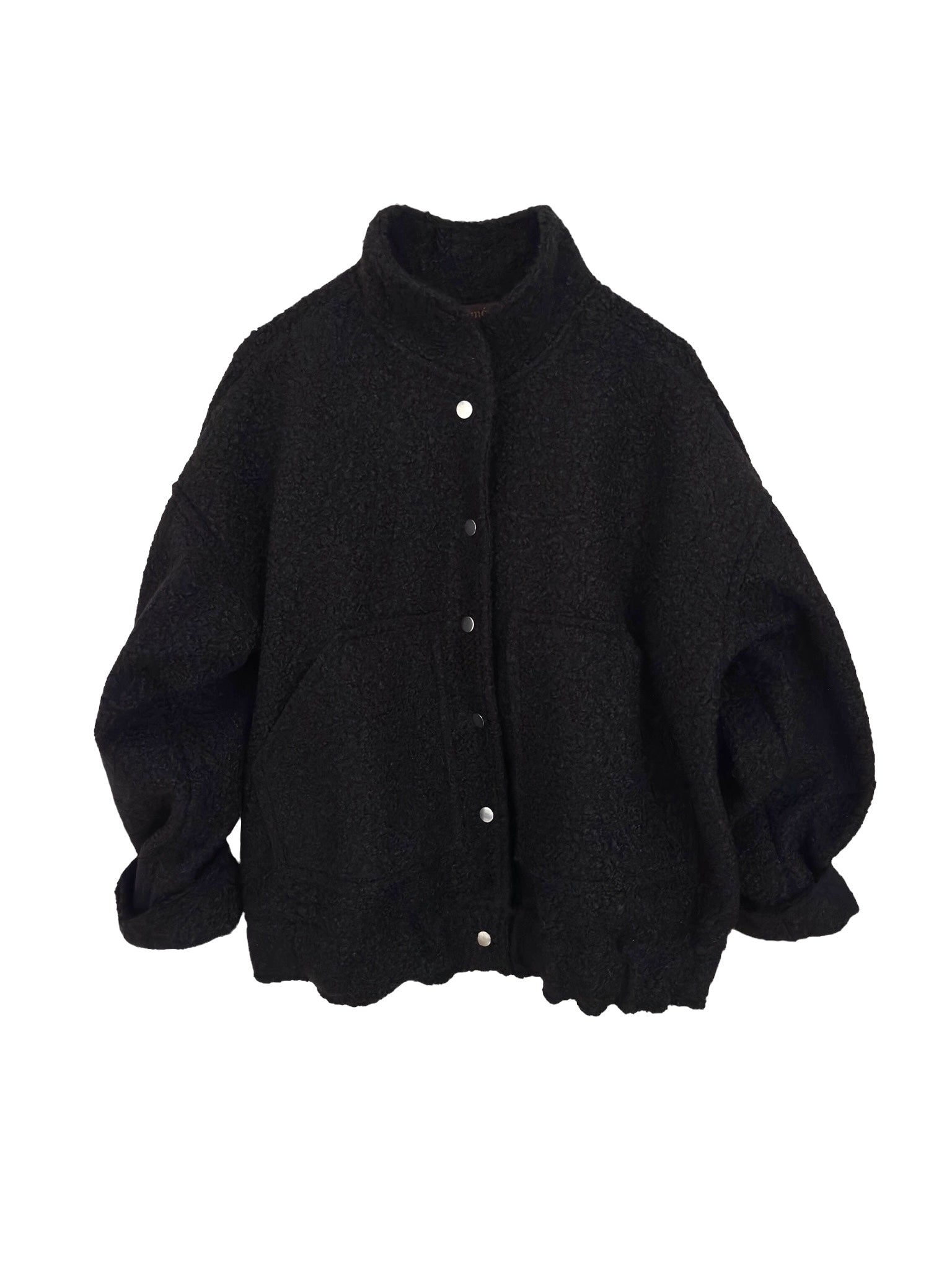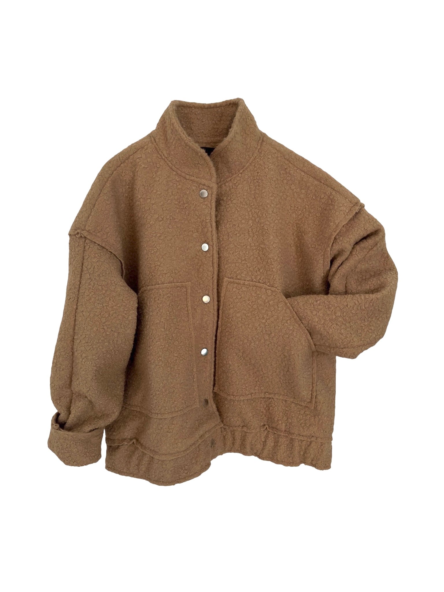 Super cool bomber jakke med høj hals og løs pasform. LOmé bomber jakken er designet som en kort jakke med en bred elastik forneden og lukkes med trykknapper.